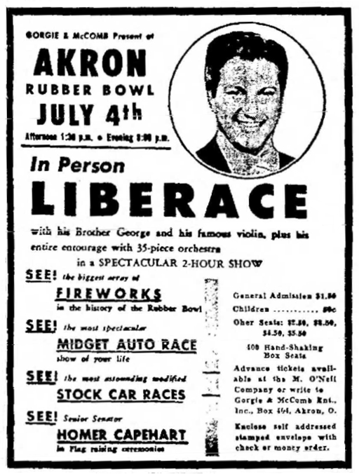 As the ad above from the July 2, 1956 Lorain Journal notes, flamboyant pianist and entertainer Liberace was to appear at two concerts at the well-known Akron venue in a big 2-hour show on July 4th. Appearing with Liberace was his brother George (and his violin) and a 35-piece orchestra.